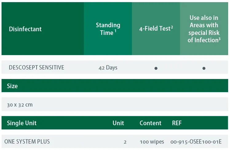 DESOTEX premium non-woven fabric is a tear-resistant and has been extensively reviewed by experts with our recommended disinfectants. ONE SYSTEM PLUS ensures optimal implementation of the desired disinfection measures with user-friendly handling, cost effectiveness and demonstrated safe results.