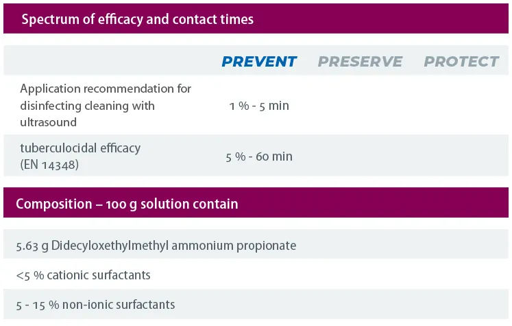 PERFEKTAN EXTRA is a powerful instrument cleaner with excellent cleaning power and a high degree of material compatibility. PERFEKTAN EXTRA contains very efficient corrosion-inhibitors and is free of aldehydes and phenols. Due to its excellent cleaning power, an antibacterial and virus inactivating cleaning of instruments is possible in a single step. The aldehyde-free formulation prevents protein fixation.