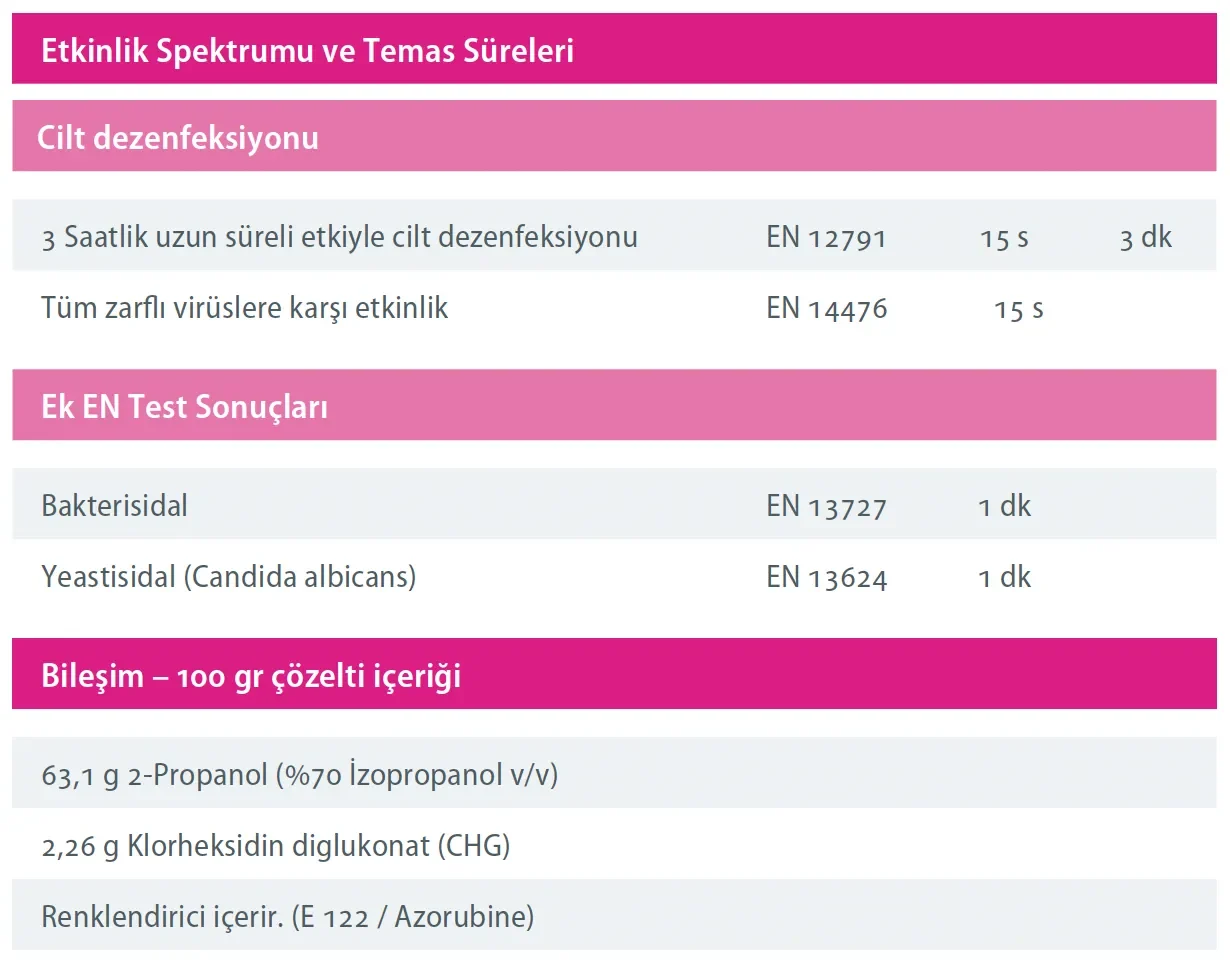 ASEPTODERM %2 CHG COLOURED kullanıma hazır, alkol bazlı bir cilt dezenfektanıdır. Kırmızı renk, cilt üzerinde dezenfekte edilen alanın işaretlenmesine yardımcı olur.