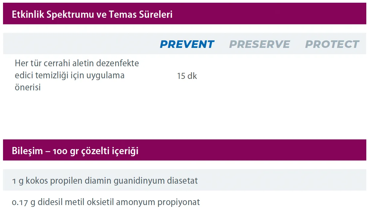 Ürün, kısa süreli dezenfektan temizlik için tasarlanmıştır. Özellikle tüm endoskoplar (fleksibl, rijit) ile termolabil ve termostabil tıbbi aletler ve materyaller için geliştirilmiştir. Tüm sirkülasyon uygulamalarında ve ultrasonik banyolarda kullanılabilir.