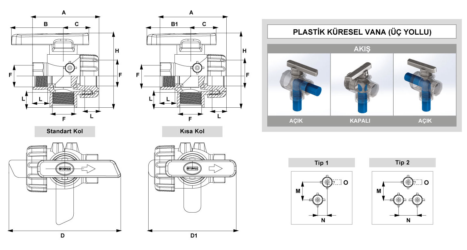 | Standart Kol | Kısa Kol | F NPT | A | B | B1 | C | D | D1 | H | L | Tip | M | N | O |