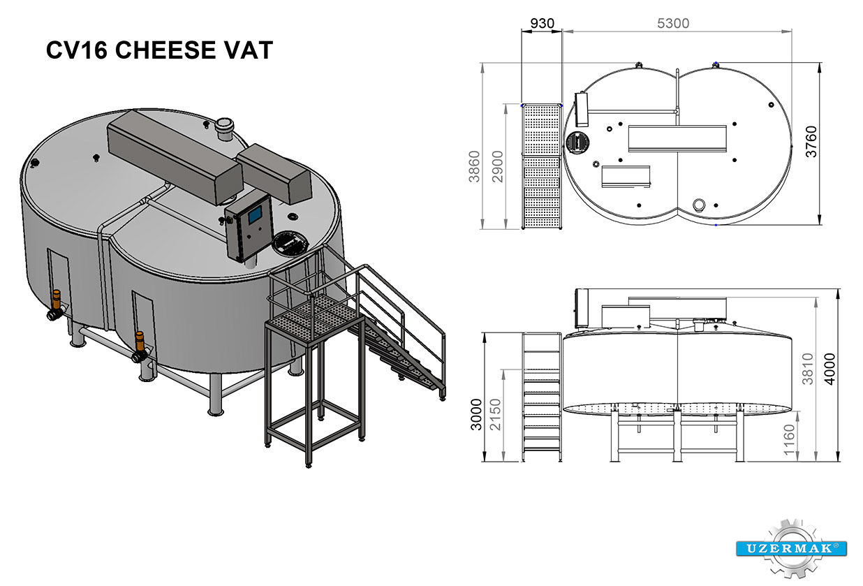 Les cuves de preparation du Caillé d’Uzermak sont conçues pour la production de caillé et de lactosérum. Elles sont adaptées à la production de plusieurs types de fromage : fromage Kashkaval, mozzarella, Halloumi, gouda, fromage lactique, cheddar…